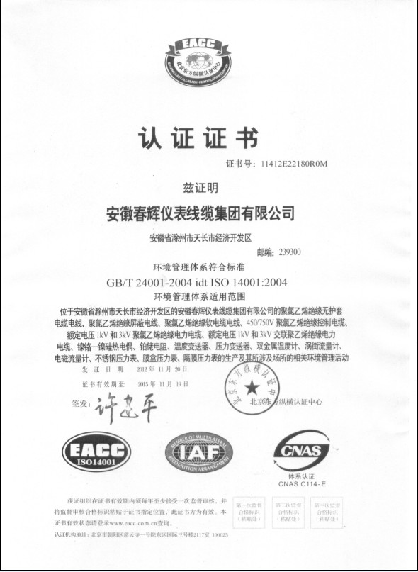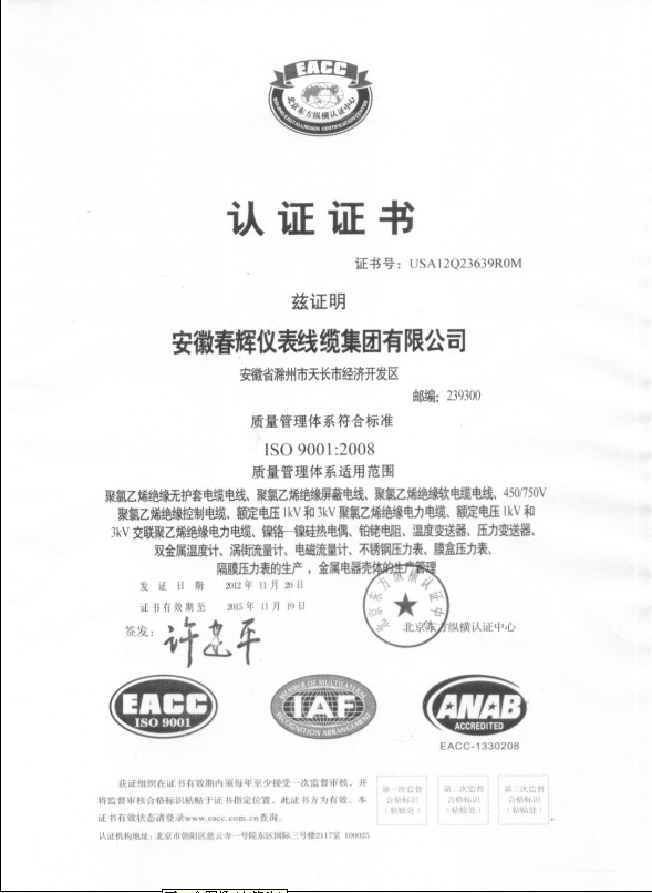 2012/11/20安徽春輝儀表線纜集團(tuán)有限公司經(jīng)北京東方縱橫認(rèn)證中心重新復(fù)查和審核頒發(fā) ISO9001:2008質(zhì)量管理體系證書(shū),GB/T24001-2004idt ISO 14001:2004環(huán)境質(zhì)量管理體系證書(shū)和 GB/T28001-2011職業(yè)健康安全管理體系證書(shū)。