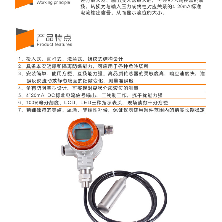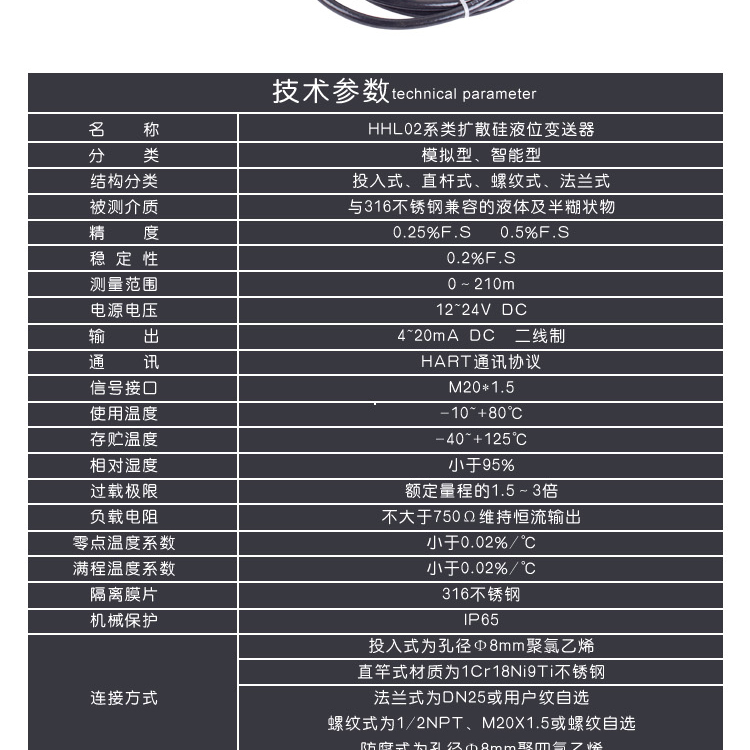 HHLT02智能擴散硅液位變送器有投入式、直桿式、法蘭式、螺紋式結構設計;安裝簡單、使用方便、互換能力強。高品質傳感器的靈敏度高,響應速度快,****反映流動或靜態(tài)液面的細微變化,測量****度。