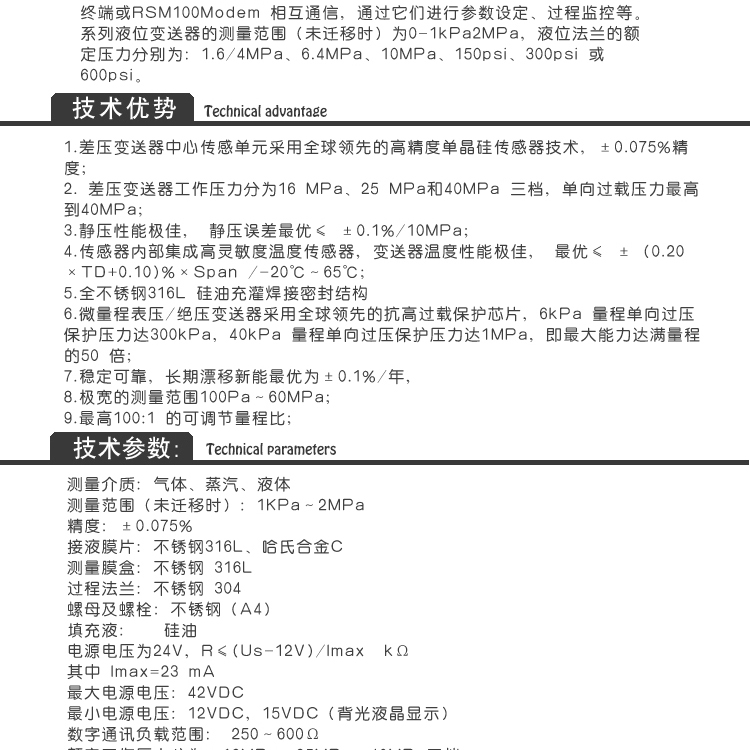 微量程表壓/絕壓變送器采用************的抗高過(guò)載保護(hù)芯片,6kPa 量程單向過(guò)壓保護(hù)壓力達(dá)300kPa,40kPa 量程單向過(guò)壓保護(hù)壓力達(dá)1MPa,即****能力達(dá)滿量程的50 倍,穩(wěn)定可靠,長(zhǎng)期漂移新能******為±0.1%/年,極寬的測(cè)量范圍100Pa~60MPa,最高100:1 的可調(diào)節(jié)量程比