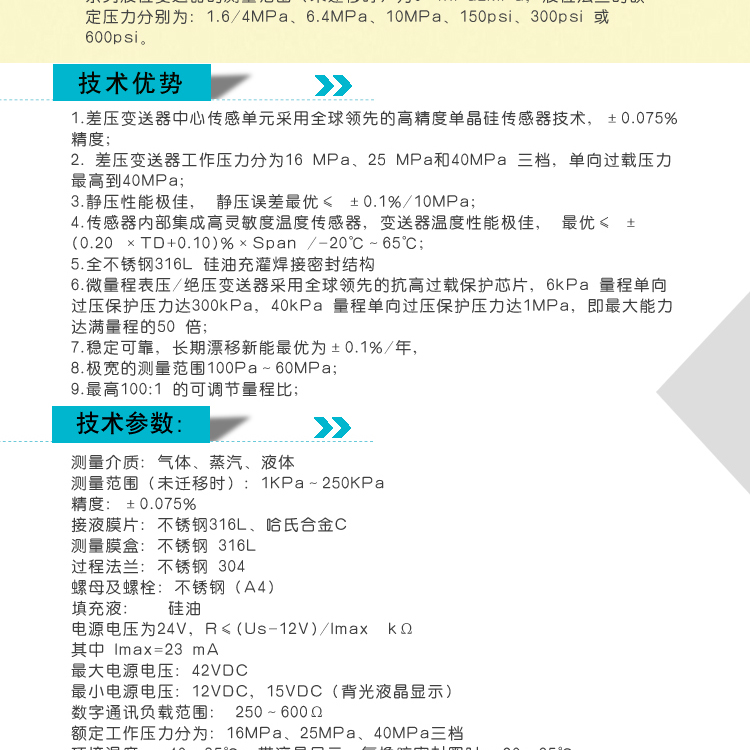 全不銹鋼316L 硅油充灌焊接密封結(jié)構(gòu),傳感器內(nèi)部集成高靈敏度溫度傳感器,變送器溫度性能****,靜壓性能****, 靜壓誤差******≤ ±0.1%/10MPa。
